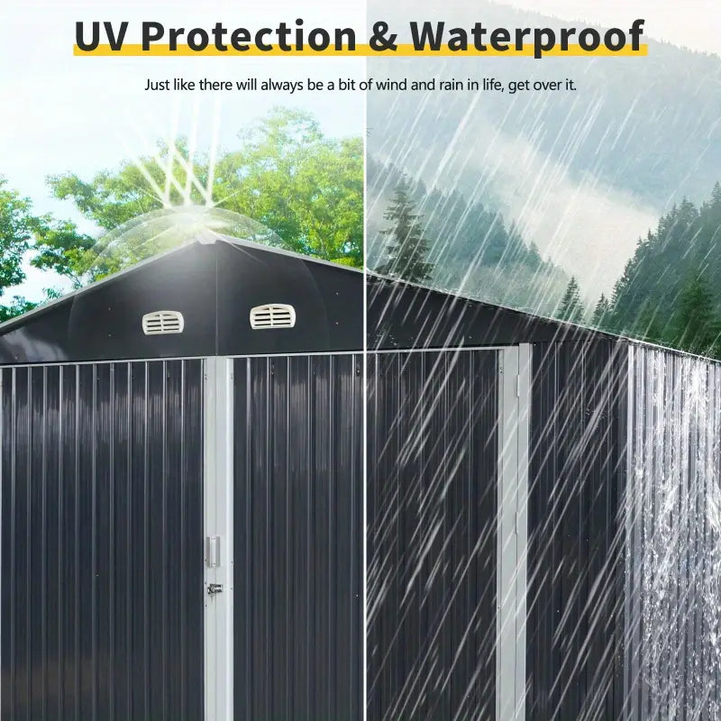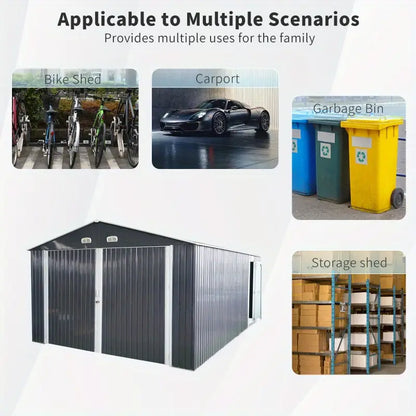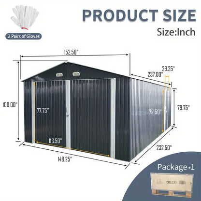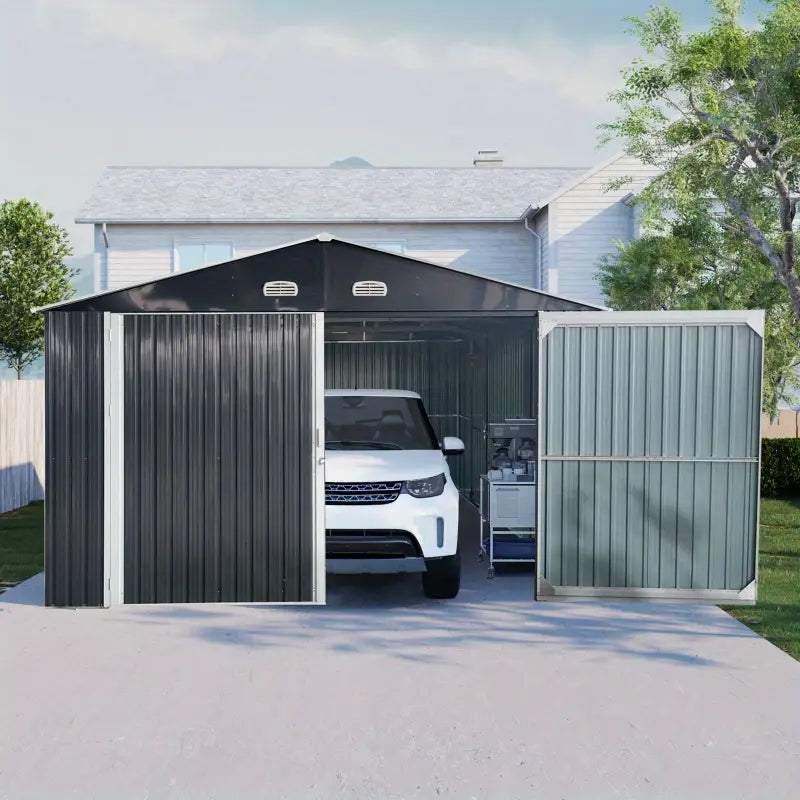 This 13' x 10' Metal Garage Shed is designed for secure and spacious storage of your car, bike, lawn mower, and other outdoor equipment. Featuring 2 easy-access doors and 4 built-in vents for excellent airflow, this shed keeps your belongings safe and well-ventilated. Constructed with high-quality galvanized steel, it's resistant to rust, corrosion, and harsh weather conditions, making it perfect for your backyard or garden. With ample space and a sturdy build, this shed is the ideal choice for anyone looking to organize and protect their outdoor tools and vehicles.