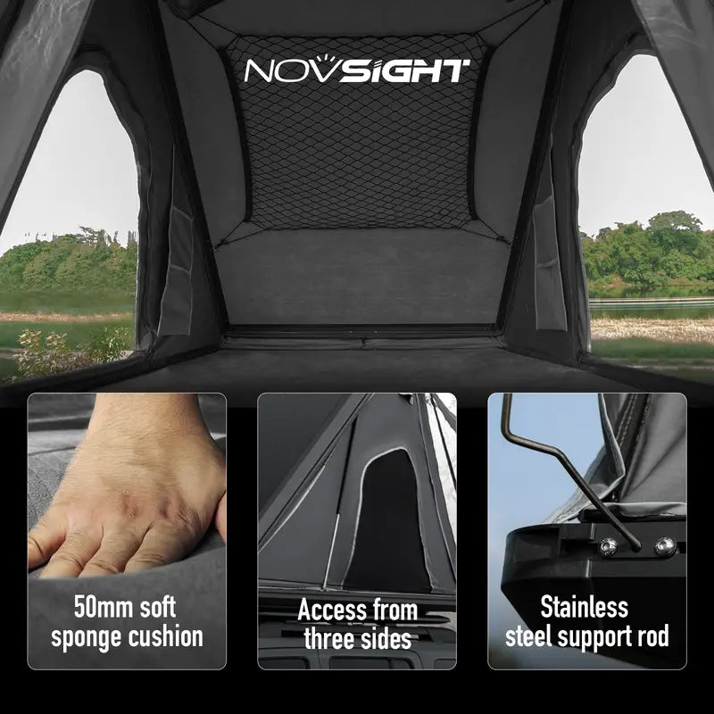 Our rooftop tent comes with a 5cm thick high-density foam mattress, ensuring a soft and cozy sleep experience without deformation, offering a more stable rest; Suitable for two adults and one child, perfect for a fantastic outdoor camping adventure with your family.