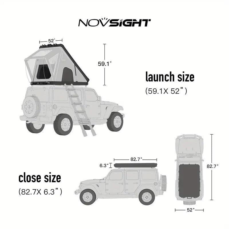 The tent's dimensions when open are 82.7"x52"x59.1" / 210cm x 132cm x 150cm, and when closed are 82.7"x52"x6.3" / 210cm x 132cm x 16cm. The sleeping footprint is 56.3" / 143cm wide. It can accommodate 2-3 people and the mattress size is 201*125*50. The peak internal height is 59.1" / 150cm. The net weight is 139 lbs (63KG). The mattress height is 50mm with a removable sponge cover. It comes with a 70-230cm retractable ladder with a weight capacity of 150kg. The package weight is 171 lbs (78KG).