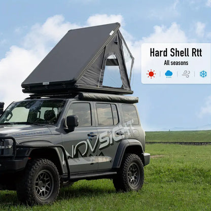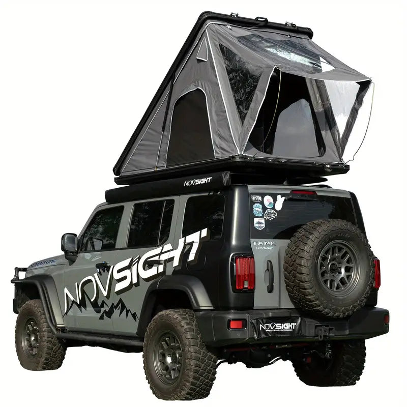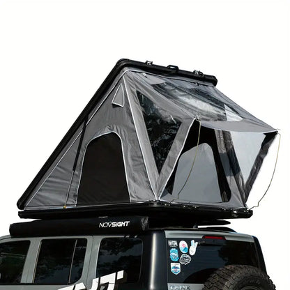 The hardshell roof top tent features a pop-up hydraulic rod system, allowing for effortless opening with a simple tug on the tension strap. The tent can be easily unfolded and closed in just 30 seconds.
